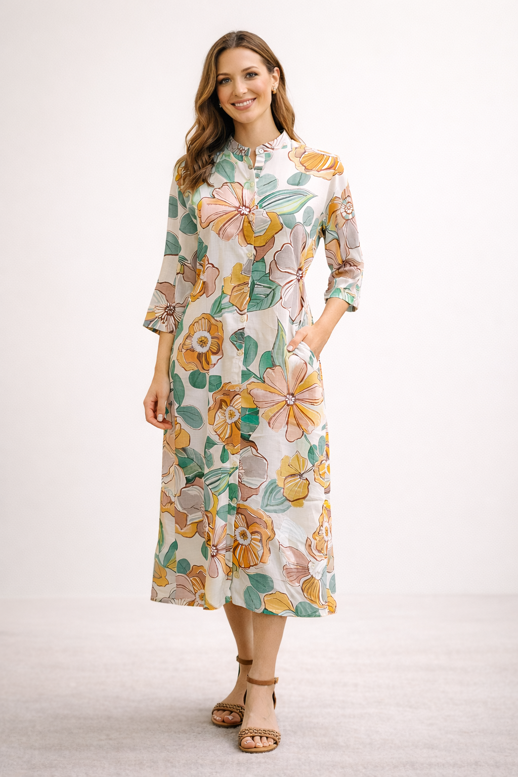 This midi dress features a soft floral print in warm, natural shades. Designed with a relaxed silhouette and a classic button-down front, it offers comfort without compromising on style.