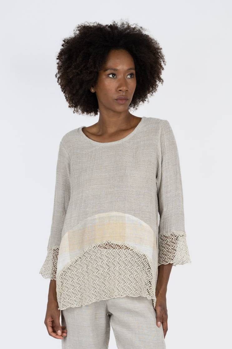 This tunic is an elegant and lightweight piece, crafted from linen and a loose-knit mesh. It has a loose and comfortable fit, perfect for a refined and relaxed look. The design is enhanced by mesh details on the sleeves and hem, creating a contrasting texture that adds originality and style. The bottom features a checked pattern that adds a distinctive touch.