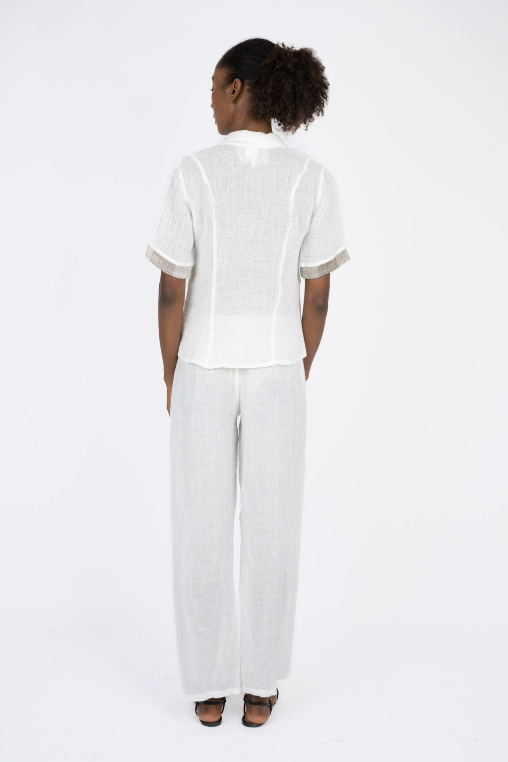 Linen shirt featuring a simple design and a slightly flared fit. The classic collar and front closure with mother-of-pearl buttons add a touch of sophistication. The short sleeves feature a checked cuff, adding a distinctive detail. The back features a center seam with a small slit for a more fluid and comfortable fit.